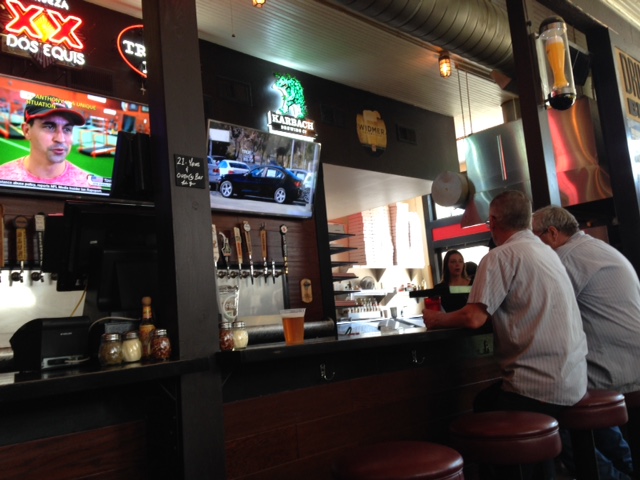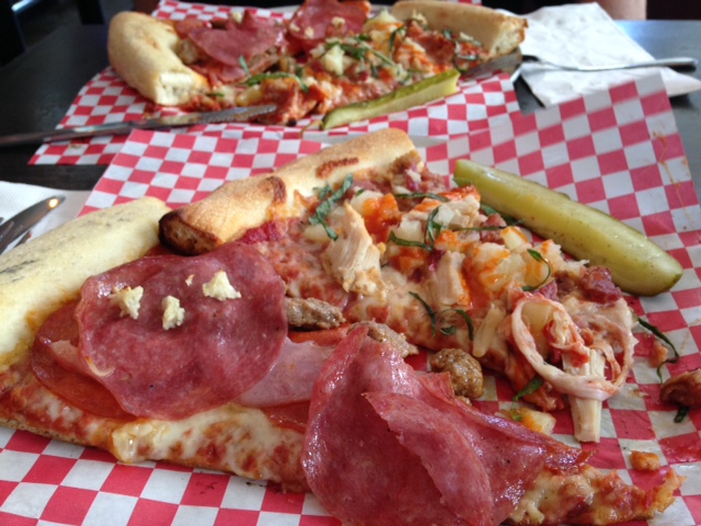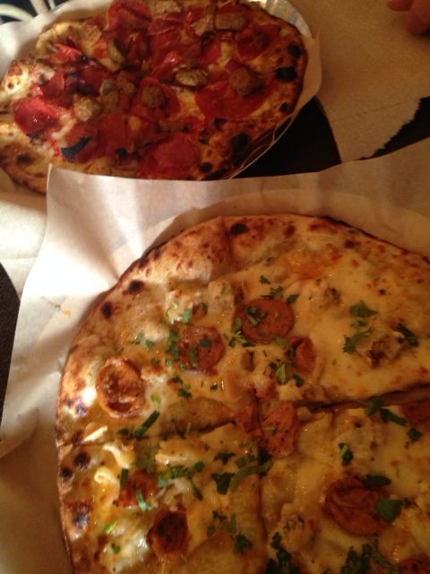 The first pizza was a create your own. You go down the line and choose your toppings. This is the Subway of pizza joints. We chose provolone/mozzarella blend, red sauce, pepperoni, salami, bacon, and butter garlic meatballs. This was the best of the two, but left us wanting. The second pizza was the Thai Potsticker pizza (chicken sausage, spicy honey, cilantro, red pepper asiago blend, and sweet thai chili cream sauce. We had high hopes, but it was very unimpressive. 2 beers, 2 pizzas – $26. Cheap, but not worth it. To be a contender, they need to work on their process. It appears to be set up so that even a caveman can make these pizzas. We won’t be back.